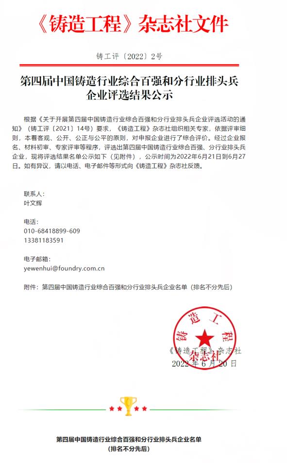 根據《關于開展第四屆中國鑄造行業綜合百強和分行業排頭兵企業評選活動的通知》(鑄工評〔2021〕14號)要求,《鑄造工程》雜志社組織相關專家,依據評審細則,本著客觀、公開、公正與公平的原則,對申報企業進行了綜...