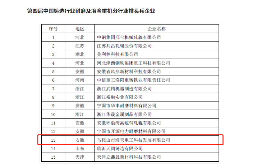 根據《關于開展第四屆中國鑄造行業綜合百強和分行業排頭兵企業評選活動的通知》(鑄工評〔2021〕14號)要求,《鑄造工程》雜志社組織相關專家,依據評審細則,本著客觀、公開、公正與公平的原則,對申報企業進行了綜合評價。經過企業報名、材料初審、專家評審等程序,評選出第四屆中國鑄造行業綜合百強、分行業排頭兵企業。海天重工被評選為“第四屆中國鑄造行業耐磨及冶金重機分行業排頭兵企業“,這是海天重工獲得的象征行業地位的又一個標志性榮譽。